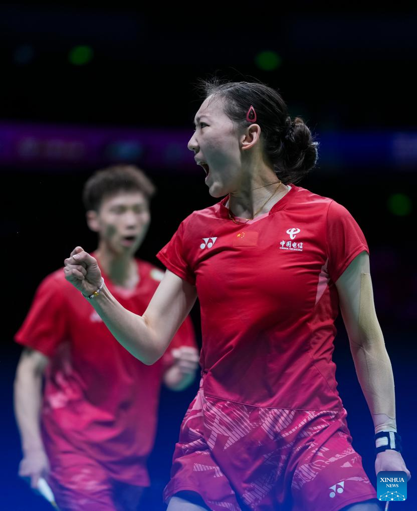 Jiang Zhenbang/Wei Yaxin (R) of China celebrate a score during the mixed doubles semifinal match against Tang Chun Man/Tse Ying Suet of China's Hong Kong at Badminton Asia Championships 2025 in Ningbo, east China's Zhejiang Province, April 12, 2025. (Xinhua/Sun Fei)