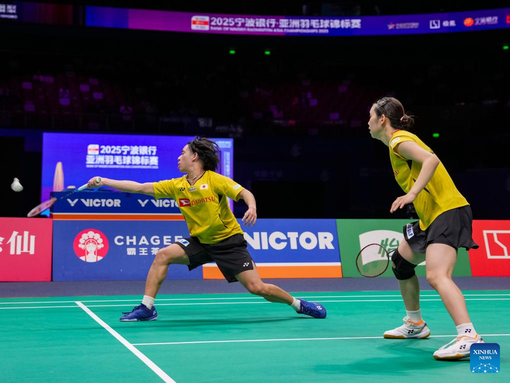 Midorikawa Hiroki (L)/Saito Natsu of Japan compete during the mixed doubles semifinal match against Jafar Hidayatullah/Felisha Alberta Nathaniel Pasaribu of Indonesia at Badminton Asia Championships 2025 in Ningbo, east China's Zhejiang Province, April 12, 2025. (Xinhua/Sun Fei)