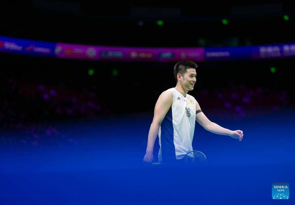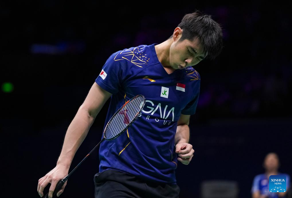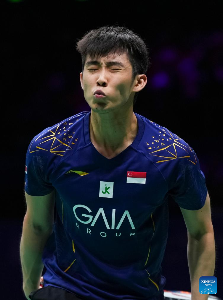 Loh Kean Yew of Singapore reacts during the men's singles semifinal against Kunlavut Vitidsarn of Thailand at Badminton Asia Championships 2025 in Ningbo, east China's Zhejiang Province, April 12, 2025. (Xinhua/Sun Fei)