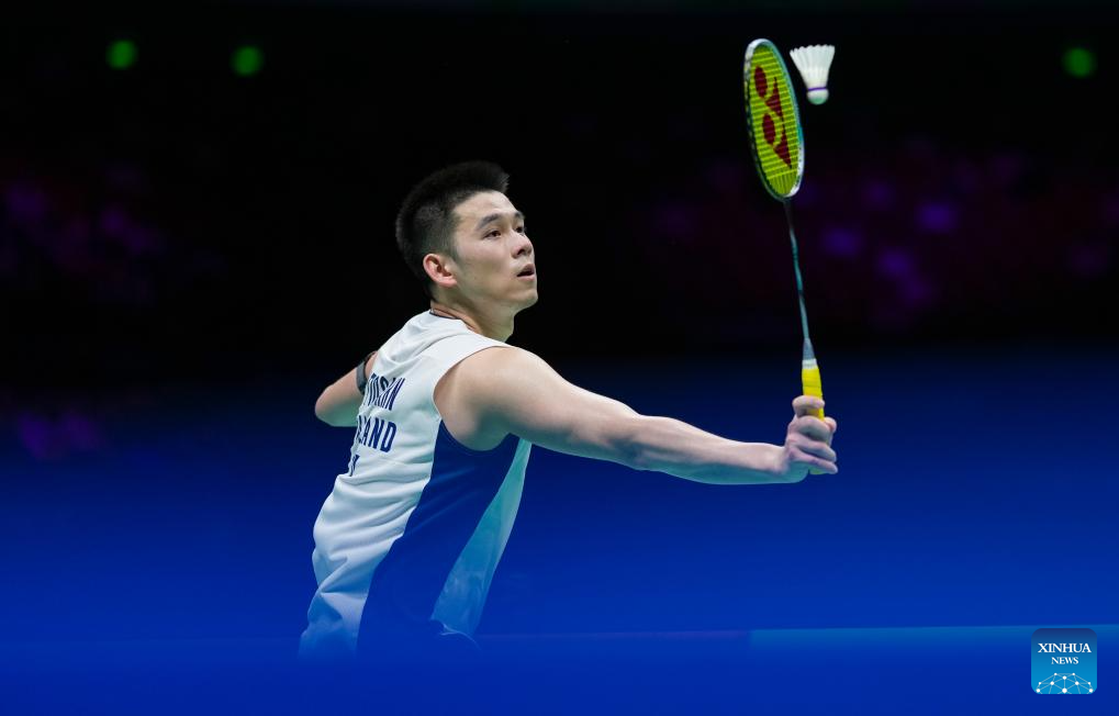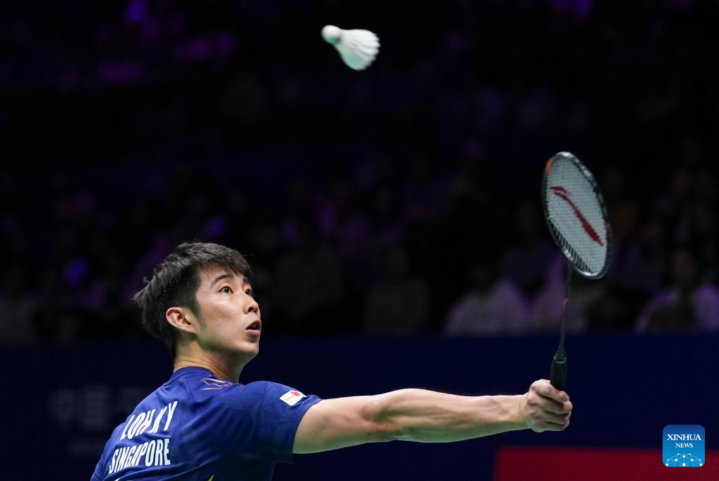 Loh Kean Yew of Singapore hits a return during the men's singles semifinal against Kunlavut Vitidsarn of Thailand at Badminton Asia Championships 2025 in Ningbo, east China's Zhejiang Province, April 12, 2025. (Xinhua/Sun Fei)