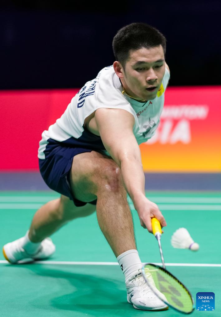 Kunlavut Vitidsarn of Thailand hits a return during the men's singles semifinal against Loh Kean Yew of Singapore at Badminton Asia Championships 2025 in Ningbo, east China's Zhejiang Province, April 12, 2025. (Xinhua/Sun Fei)
