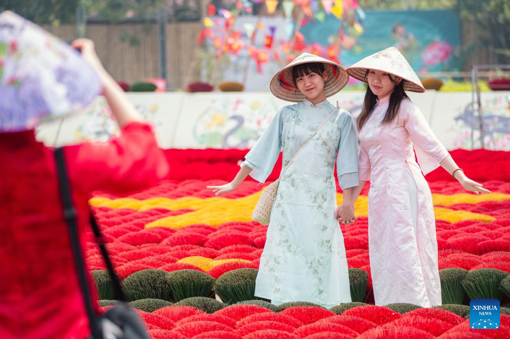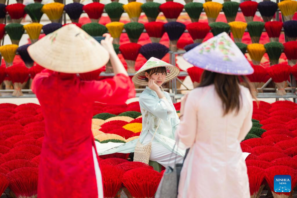 Tourists pose for photos amid bundles of incense sticks in Quang Phu Cau Village, Vietnam, March 24, 2025. Quang Phu Cau Village, 35 kilometers south of Hanoi, has a long tradition of making incense sticks.
