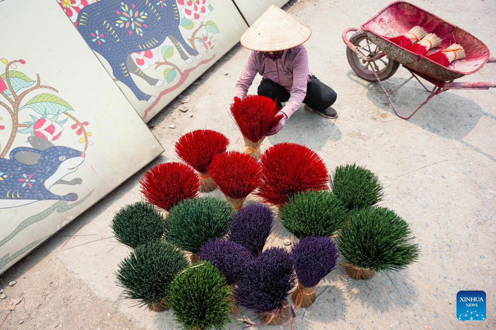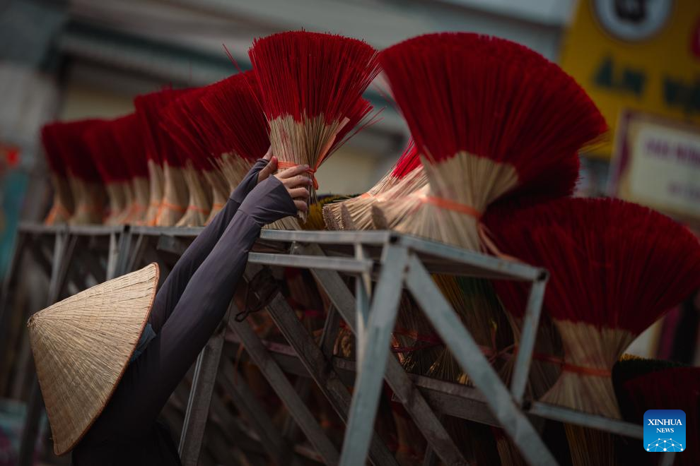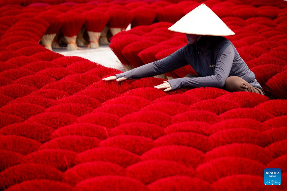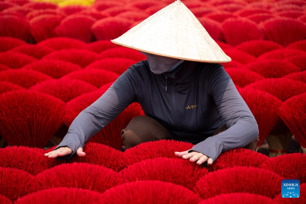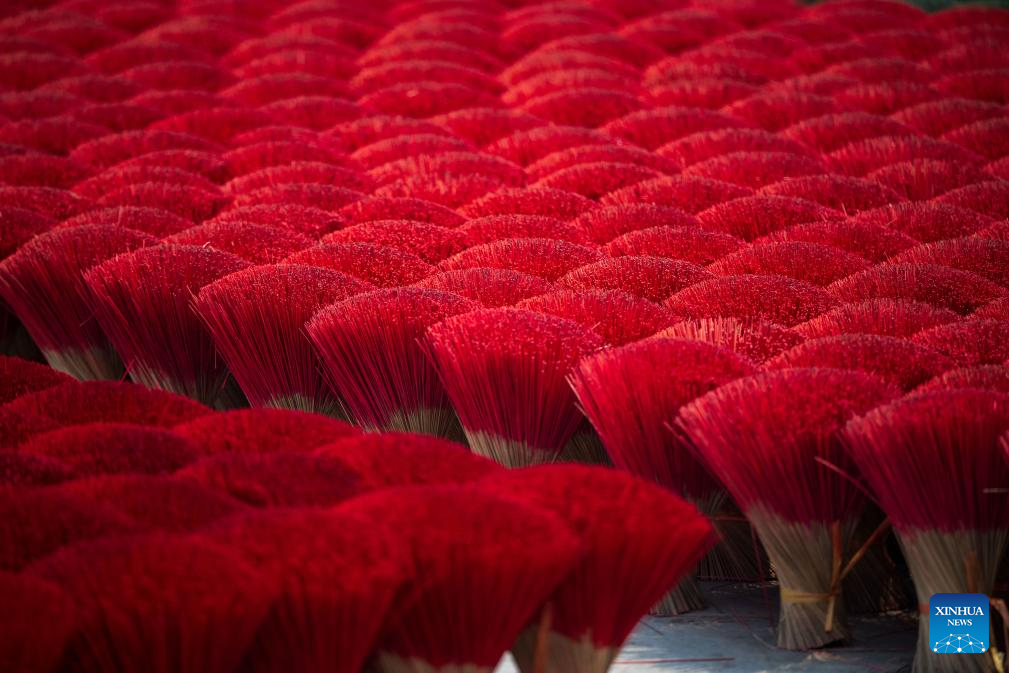 This photo shows bundles of incense sticks placed at a courtyard in Quang Phu Cau Village, Vietnam, March 24, 2025. Quang Phu Cau Village, 35 kilometers south of Hanoi, has a long tradition of making incense sticks.