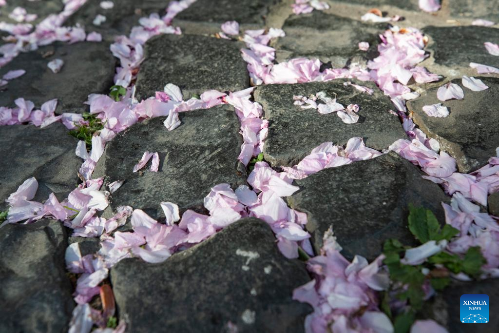 Fallen petals of cherry blossoms are seen on the ground in Bonn, Germany, April 12, 2025. (Xinhua/Zhang Fan)