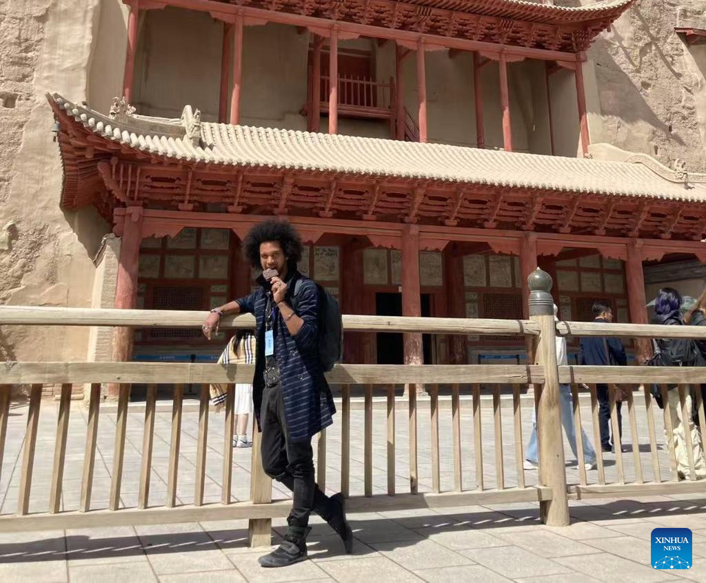 Zachary Iziah Smith, an American travel blogger, poses for a photo at Mogao Grottoes in Dunhuang, northwest China's Gansu Province, April 11, 2025. (Xinhua)