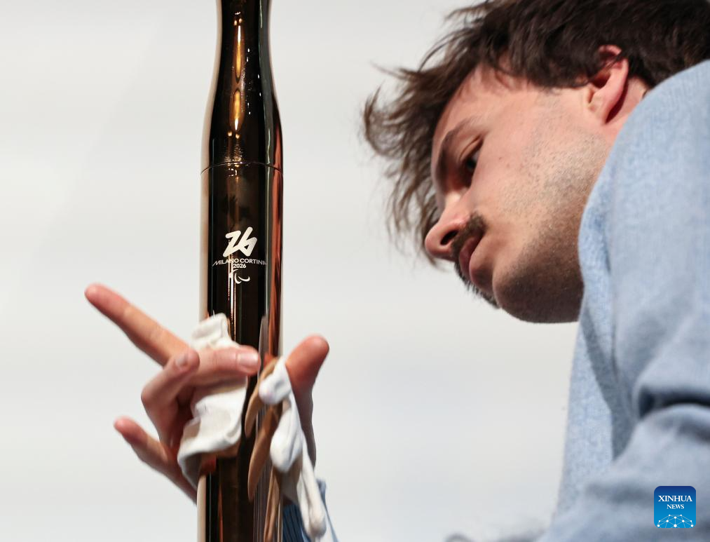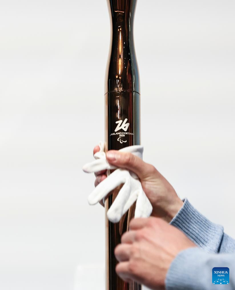 A staff member wipes the torch for Milano Cortina 2026 Paralympic Winter Games after the unveiling ceremony of the torches for Milano Cortina 2026 Olympic and Paralympic Winter Games in Milan, Italy, April 14, 2025. (Xinhua/Li Jing)