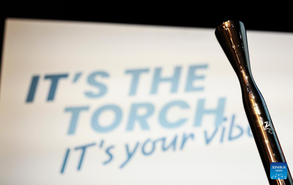 The torch for Milano Cortina 2026 Paralympic Winter Games is displayed during the unveiling ceremony of the torches for Milano Cortina 2026 Olympic and Paralympic Winter Games in Milan, Italy, April 14, 2025. (Xinhua/Li Jing)
