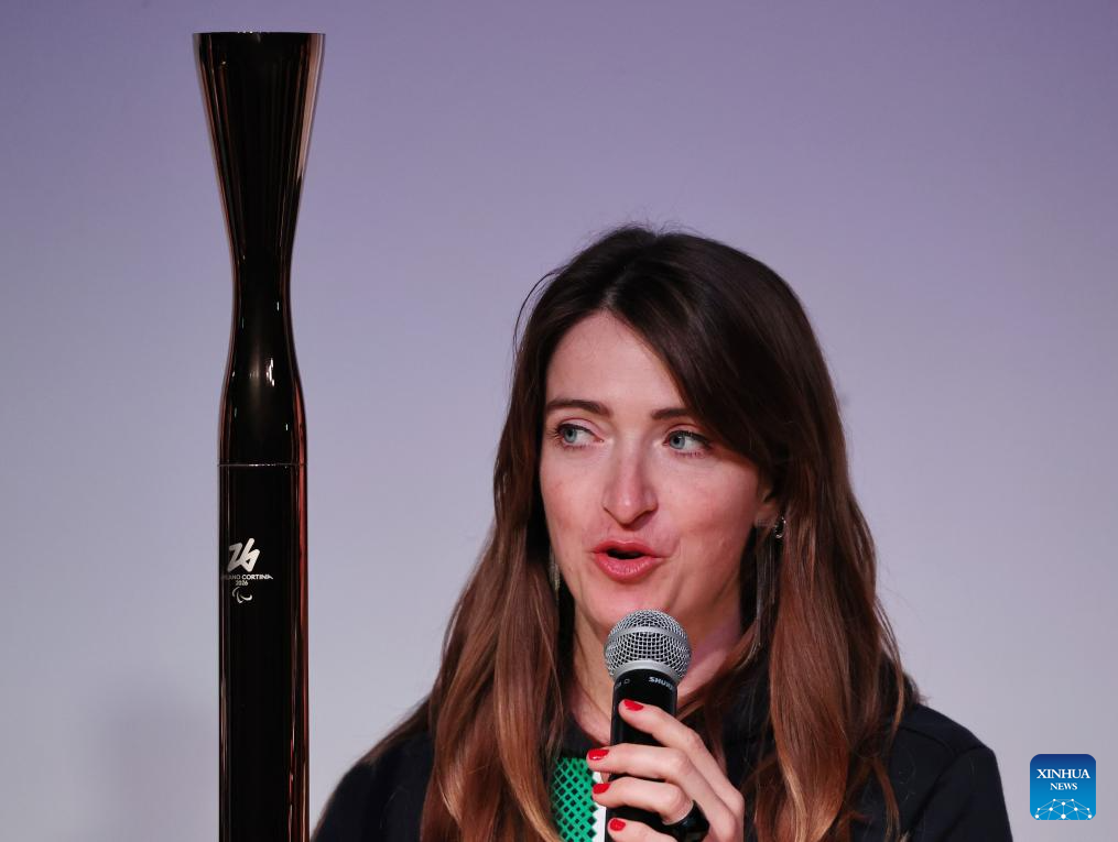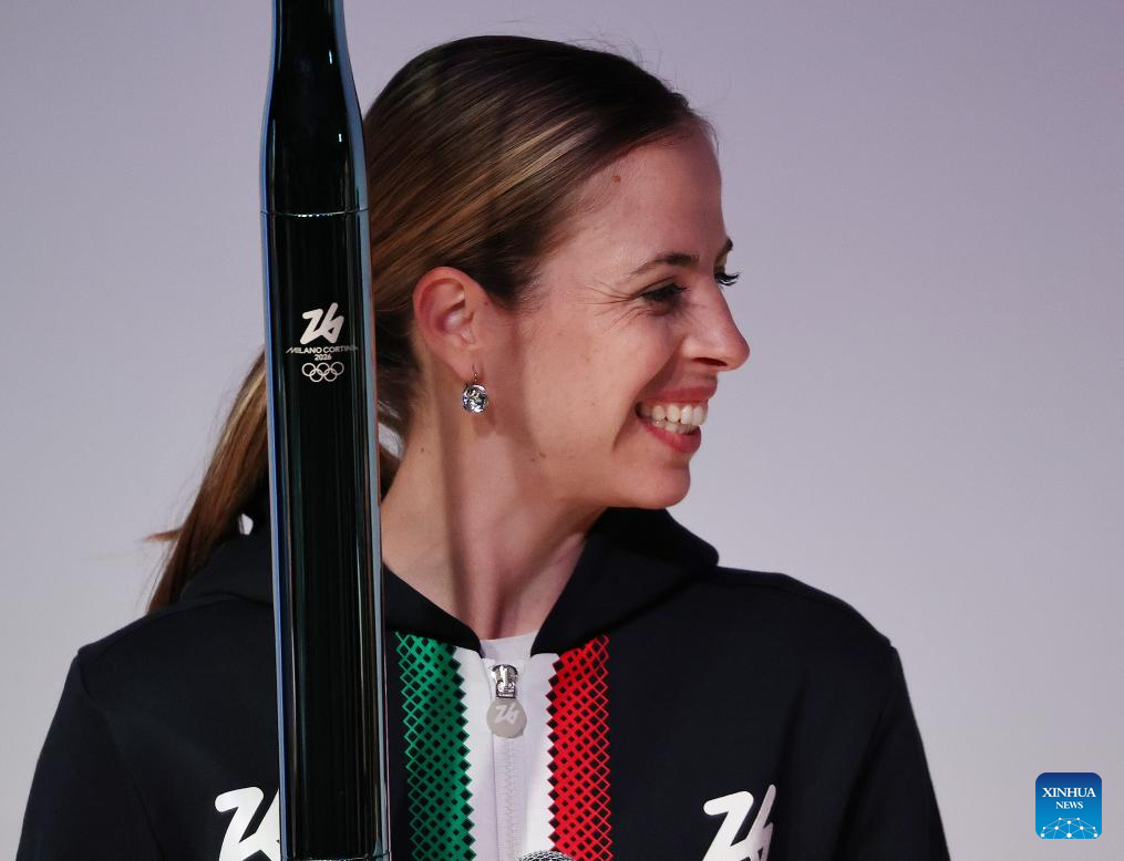 Former Italian cross-country skier Stefania Belmondo holds the Olympic torch during the unveiling ceremony of the torches for Milano Cortina 2026 Olympic and Paralympic Winter Games in Milan, Italy, April 14, 2025. (Xinhua/Li Jing)