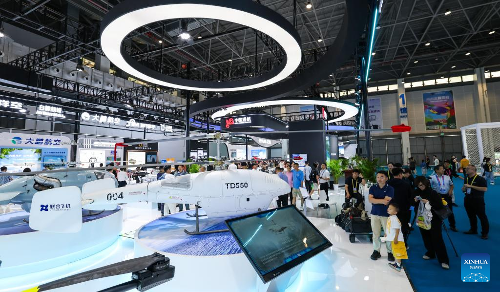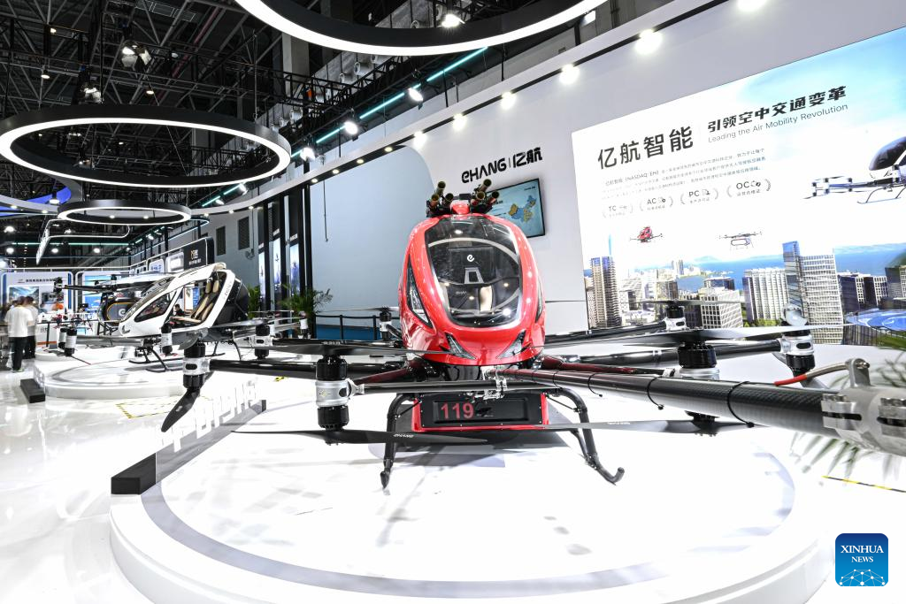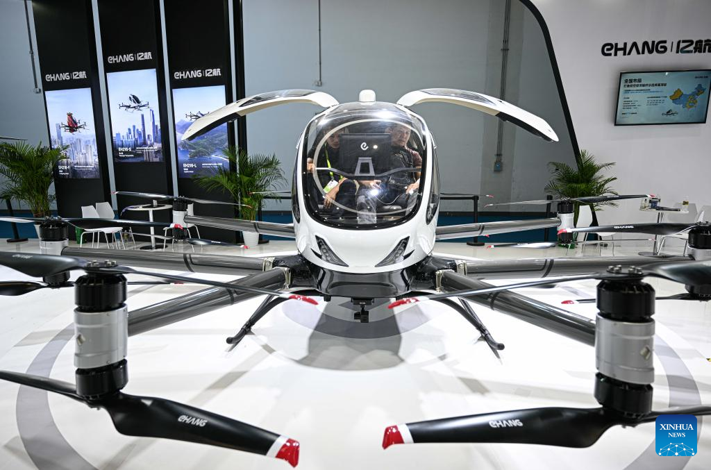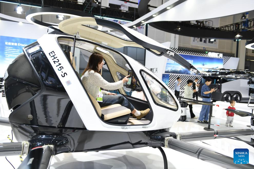 Slated from April 13 to 18, this year's expo features dedicated exhibition zones for groundbreaking innovations in artificial intelligence (AI) and low-altitude economy for the first time. Making its debut this year, the low-altitude economy zone showcases eVTOL aircraft, flying cars, and drones. (Xinhua/Guo Cheng)