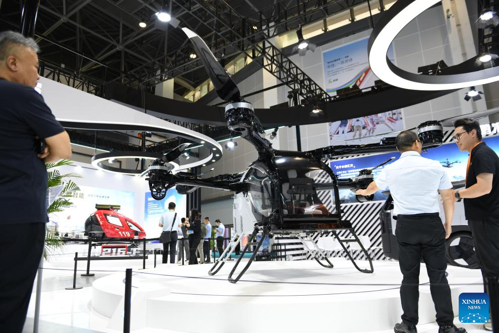Slated from April 13 to 18, this year's expo features dedicated exhibition zones for groundbreaking innovations in artificial intelligence (AI) and low-altitude economy for the first time. Making its debut this year, the low-altitude economy zone showcases electric vertical takeoff and landing (eVTOL) aircraft, flying cars, and drones. (Xinhua/Sun Xiaotian)