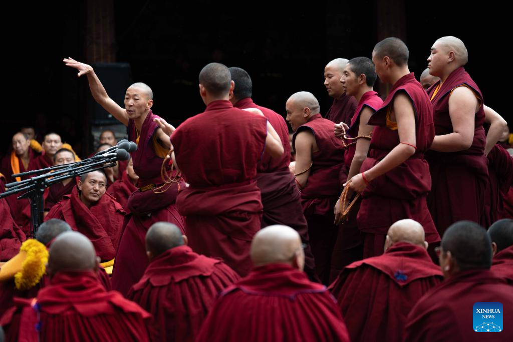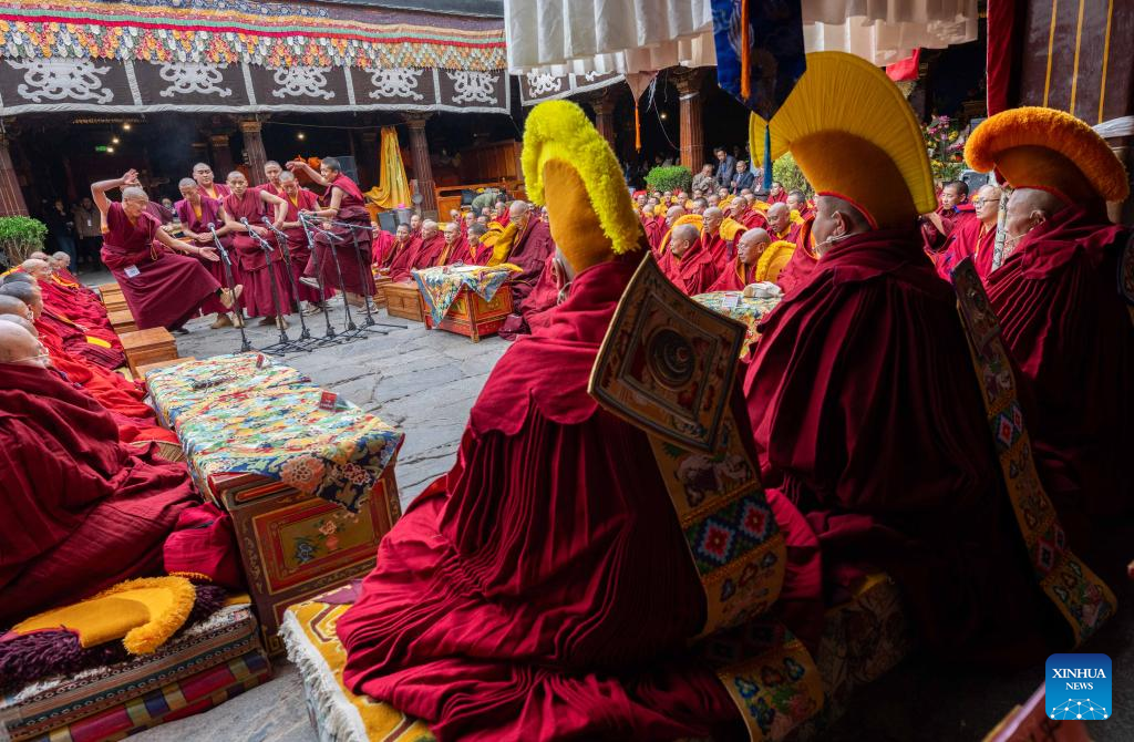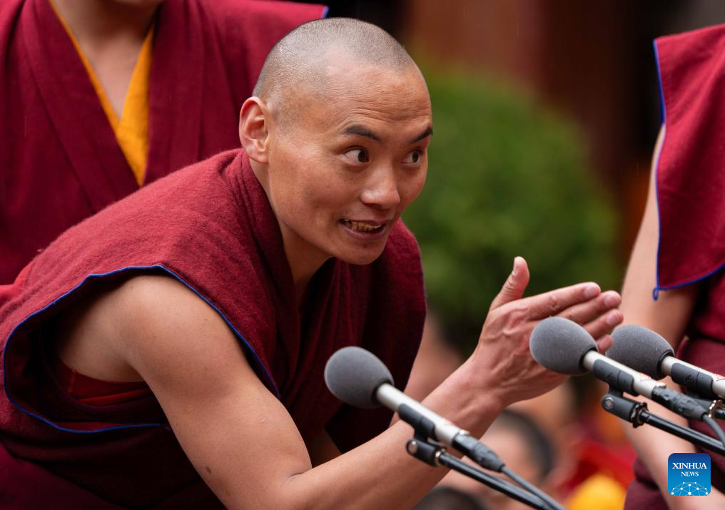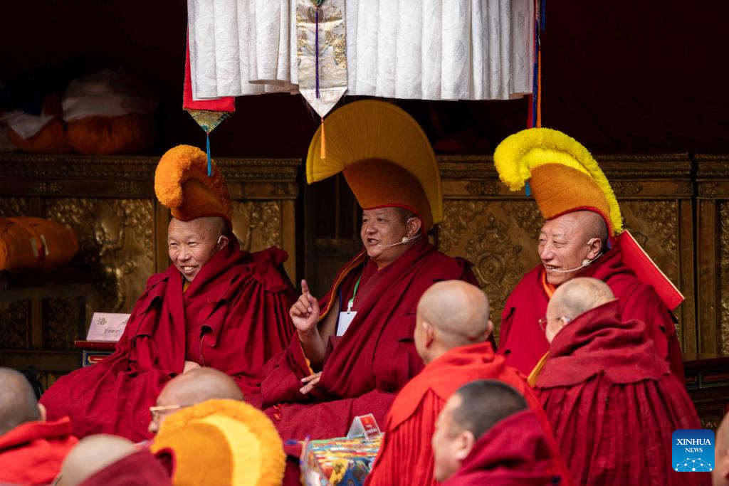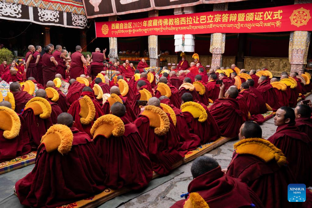 Monks attend a debate and award ceremony conferring the title of Geshe Lharampa at the Jokhang Temple in Lhasa, capital of southwest China's Xizang Autonomous Region, April 15, 2025. Thirteen monks obtained the degree of Geshe Lharampa, the highest academic degree in the exoteric teachings of the Gelug school of Tibetan Buddhism, here on Tuesday. Geshe Lharampa, which means "intellectual" in the Tibetan language, is the equivalent of a doctoral degree in modern education. (Xinhua/Tenzing Nima Qadhup)