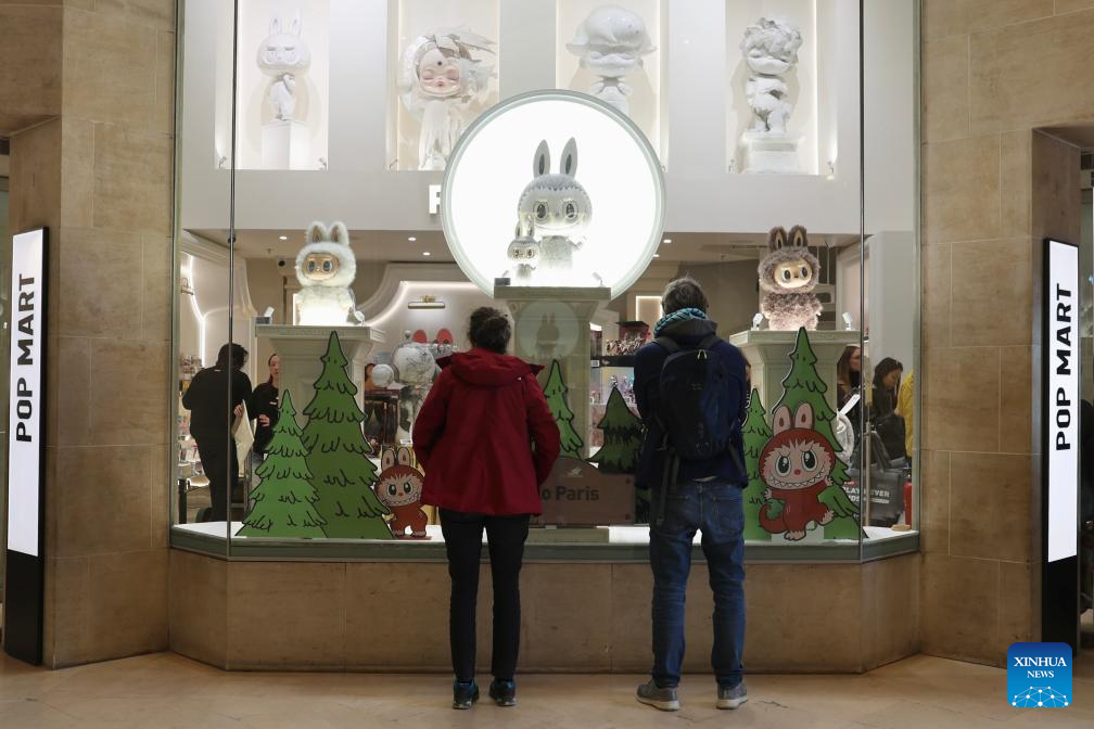 People linger around a POP MART store, a Chinese pop culture brand, near Louvre Museum in Paris, France, on March 18, 2025. (Xinhua/Zhang Baihui)