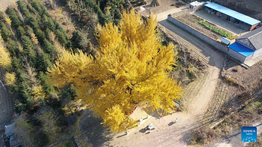 An aerial drone photo taken in Autumn 2023 shows a 1,400-year-old ginkgo tree in Dalian City, northeast China's Liaoning Province. (Xinhua)