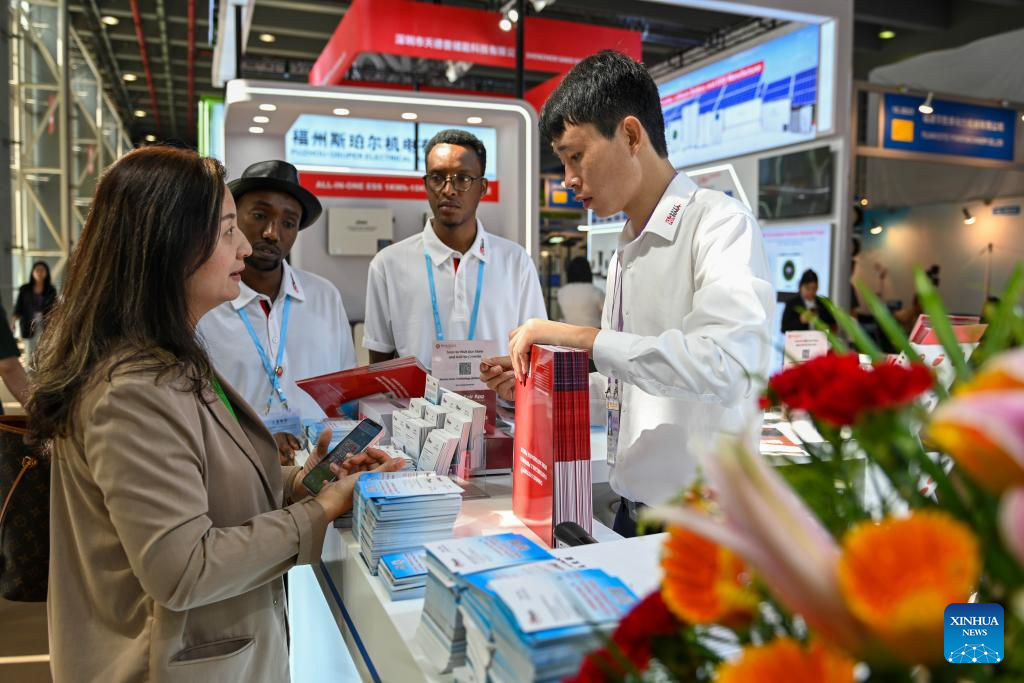 Foreign buyers learn about products at the exhibition area of new energy resources during the 137th edition of the China Import and Export Fair in Guangzhou, south China's Guangdong Province, April 16, 2025. The 137th edition of the China Import and Export Fair, also known as the Canton Fair, kicked off on Tuesday, with the number of export exhibitors exceeding 30,000 for the first time in the history of this famous event.