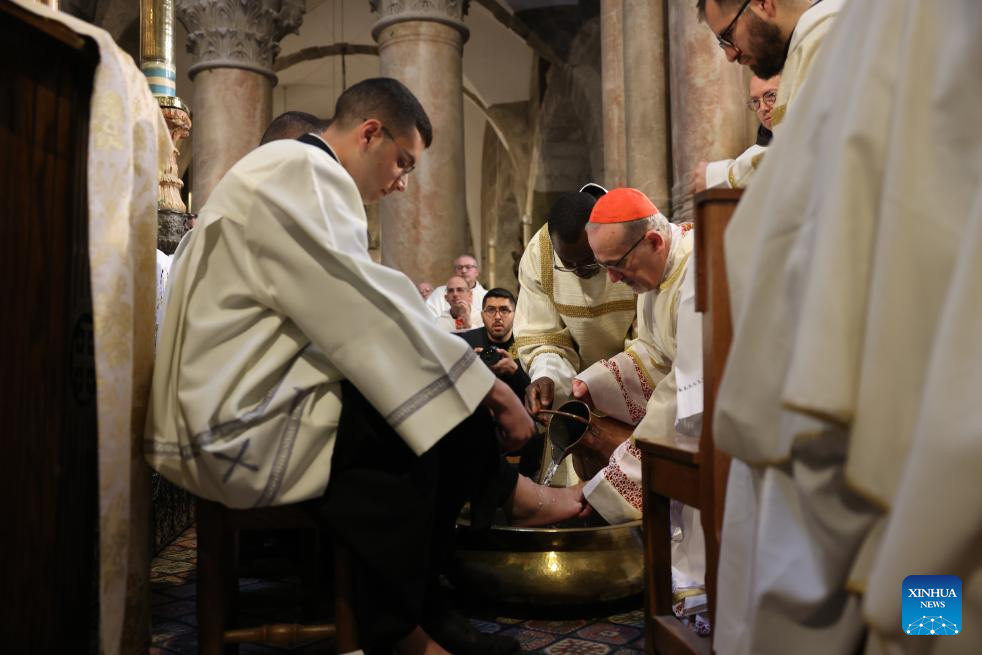 Christian monks and friars take part in the Catholic Washing of the Feet ceremony during Easter Holy Week, at the Church of the Holy Sepulchre in Jerusalem, on April 17, 2025. (Photo by Jamal Awad/Xinhua)