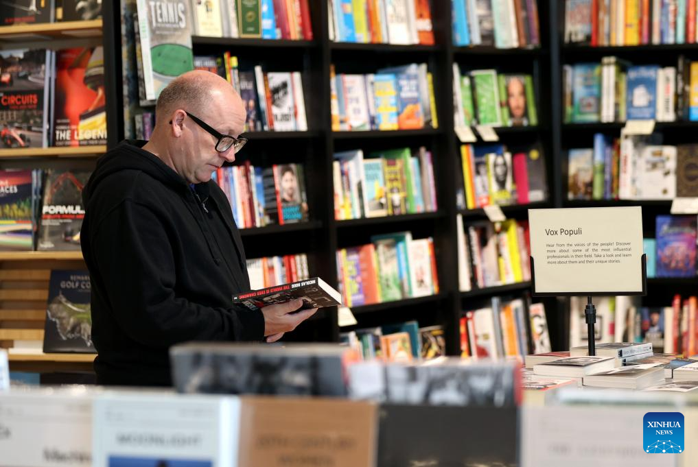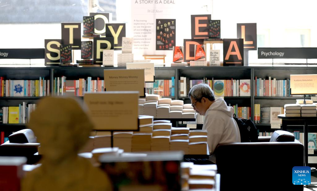 A man reads at Waterstones' flagship Piccadilly bookshop in London, Britain, April 17, 2025. Britain's largest book chain, Waterstones, attracts a large number of readers to experience the charm of paper books. (Xinhua/Li Ying)