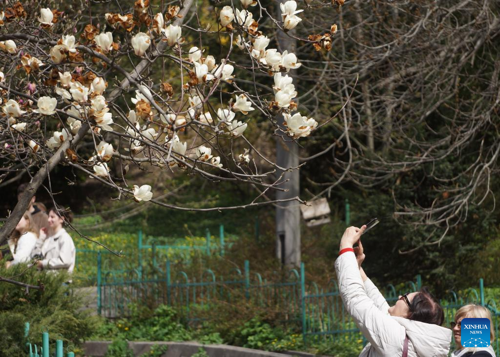 People enjoy blossoms at a botanical garden in Kiev, Ukraine, April 17, 2025. (Photo by Roman Petushkov/Xinhua)