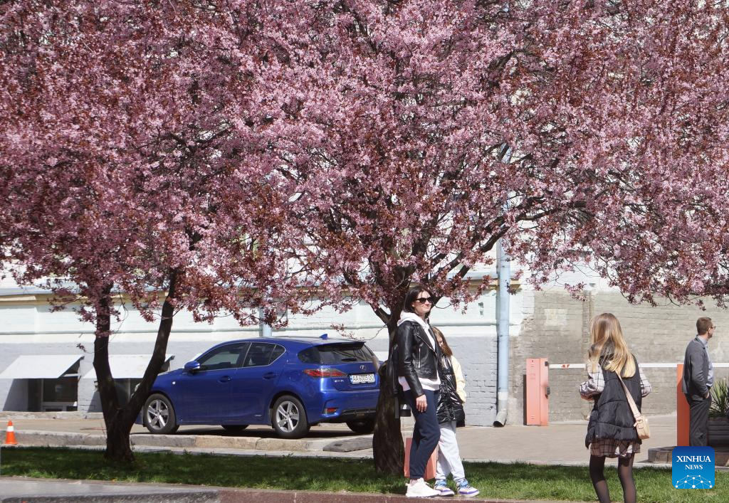 People walk under cherry blossoms in Kiev, Ukraine, April 17, 2025. (Photo by Roman Petushkov/Xinhua)