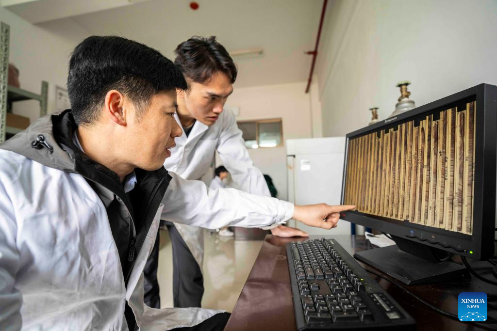 Wu Lei (L), a specialist in ancient tree conservation, instructs a student to identify the tree age at the tree-ring identification laboratory of Central South University of Forestry and Technology in Changsha, central China's Hunan Province, March 31, 2025.(Xinhua/Chen Sihan)