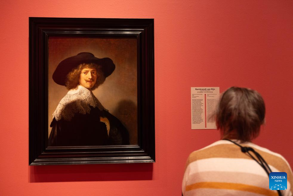 A visitor views an artwork during the exhibition "From Rembrandt to Vermeer: Masterpieces from the Leiden Collection" in Amsterdam, the Netherlands, April 17, 2025. Featuring 75 works by 27 artists from the 17th-century Dutch Golden Age, including pieces by Rembrandt van Rijn and Johannes Vermeer, the exhibition runs from April 9 to August 24, 2025. (Photo by Sylvia Lederer/Xinhua)