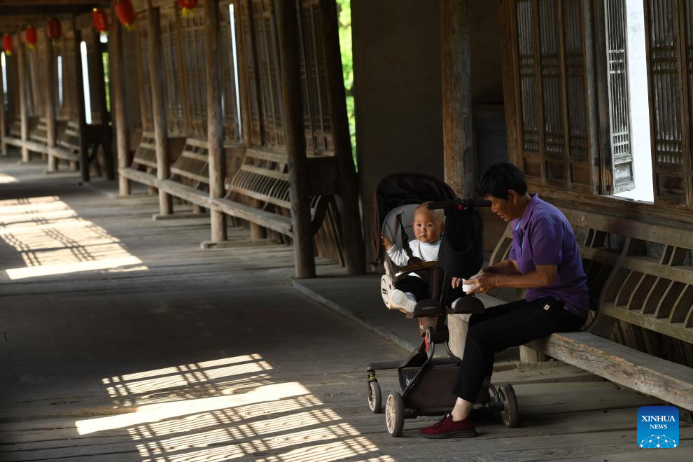 Residents enjoy leisure time in the Gongbei roofed bridge in Xiuning County of Huangshan City, east China's Anhui Province, May 15, 2024. Roofed bridge, also called covered bridge, is a unique architectural structure in Huangshan City. These ingeniously structured and elegantly shaped bridges carry rich cultural significance and form a distinctive part of Huizhou culture.