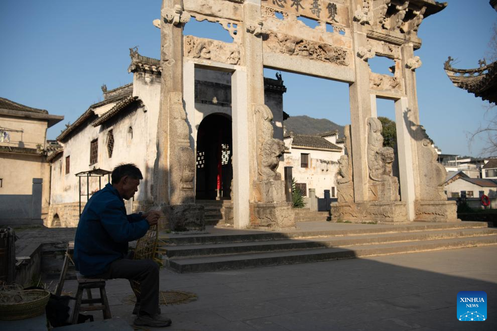 A resident makes bamboo-weaving products near the Gaoyang roofed bridge in Shexian County of Huangshan City, east China's Anhui Province, March 25, 2025. Roofed bridge, also called covered bridge, is a unique architectural structure in Huangshan City. These ingeniously structured and elegantly shaped bridges carry rich cultural significance and form a distinctive part of Huizhou culture.