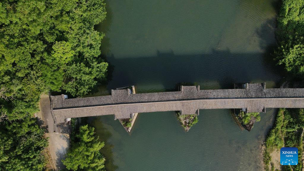 An aerial drone photo taken on May 15, 2024 shows the Gongbei roofed bridge in Xiuning County of Huangshan City, east China's Anhui Province. Roofed bridge, also called covered bridge, is a unique architectural structure in Huangshan City. These ingeniously structured and elegantly shaped bridges carry rich cultural significance and form a distinctive part of Huizhou culture.