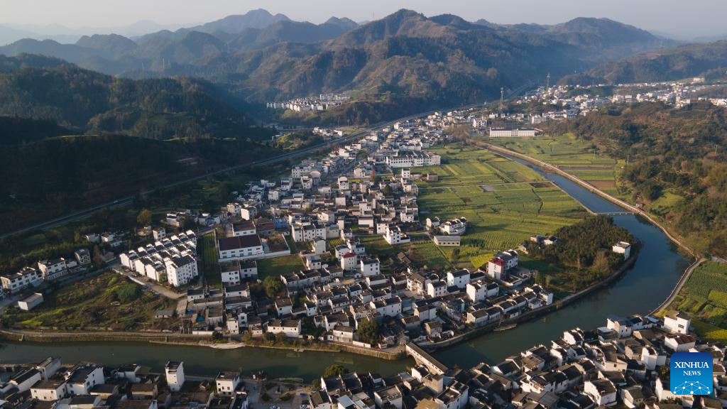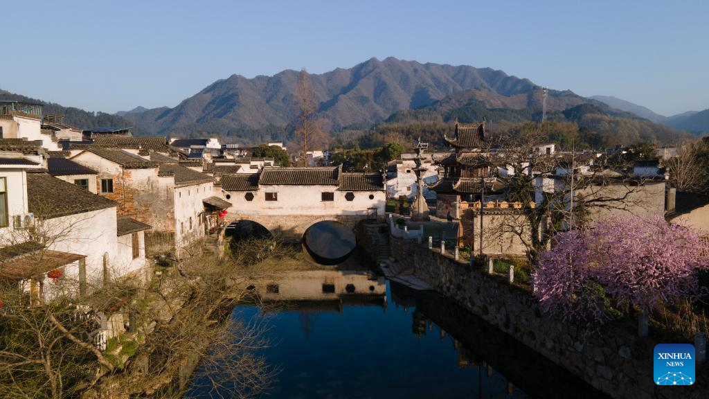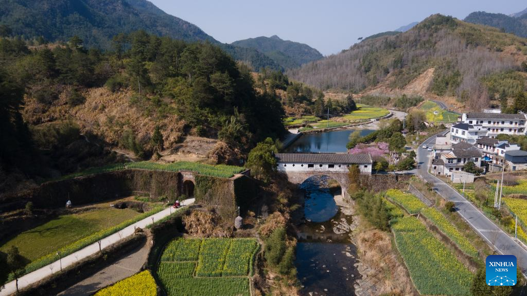 An aerial drone photo taken on March 24, 2025 shows the Bei'an roofed bridge and the scenery of surrounding areas in Shexian County of Huangshan City, east China's Anhui Province. Roofed bridge, also called covered bridge, is a unique architectural structure in Huangshan City. These ingeniously structured and elegantly shaped bridges carry rich cultural significance and form a distinctive part of Huizhou culture.