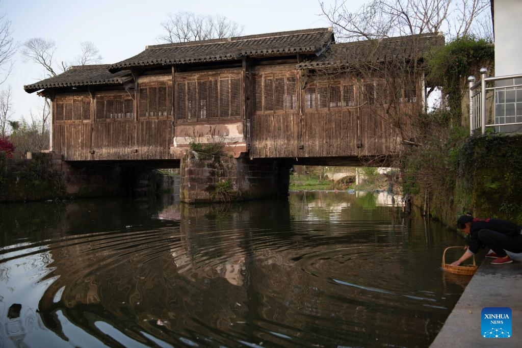 A resident is pictured near the Leshou roofed bridge in Tunxi District of Huangshan City, east China's Anhui Province, April 2, 2025. Roofed bridge, also called covered bridge, is a unique architectural structure in Huangshan City. These ingeniously structured and elegantly shaped bridges carry rich cultural significance and form a distinctive part of Huizhou culture.