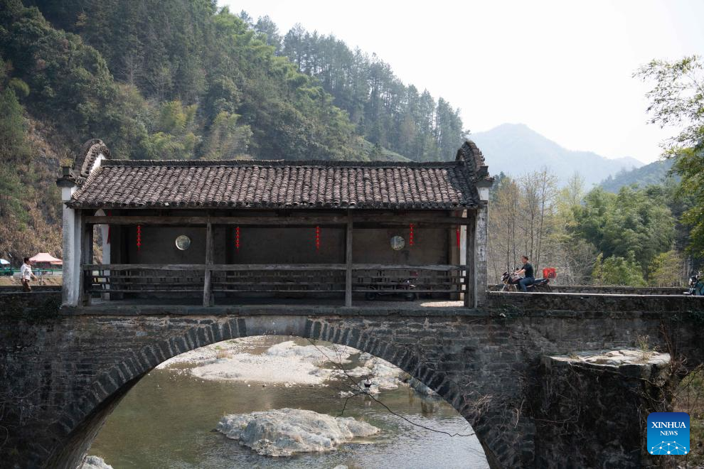 This photo taken on March 26, 2025 shows the Sankeshu roofed bridge in Xiuning County of Huangshan City, east China's Anhui Province. Roofed bridge, also called covered bridge, is a unique architectural structure in Huangshan City. These ingeniously structured and elegantly shaped bridges carry rich cultural significance and form a distinctive part of Huizhou culture.
