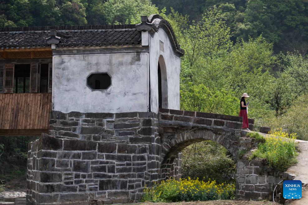 A tourist walks on the Gongbei roofed bridge in Xiuning County of Huangshan City, east China's Anhui Province, April 11, 2025. Roofed bridge, also called covered bridge, is a unique architectural structure in Huangshan City. These ingeniously structured and elegantly shaped bridges carry rich cultural significance and form a distinctive part of Huizhou culture.