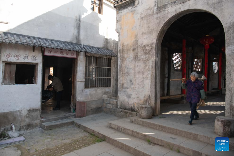 A resident walks out of the Gaoyang roofed bridge in Shexian County of Huangshan City, east China's Anhui Province, March 25, 2025. Roofed bridge, also called covered bridge, is a unique architectural structure in Huangshan City. These ingeniously structured and elegantly shaped bridges carry rich cultural significance and form a distinctive part of Huizhou culture.