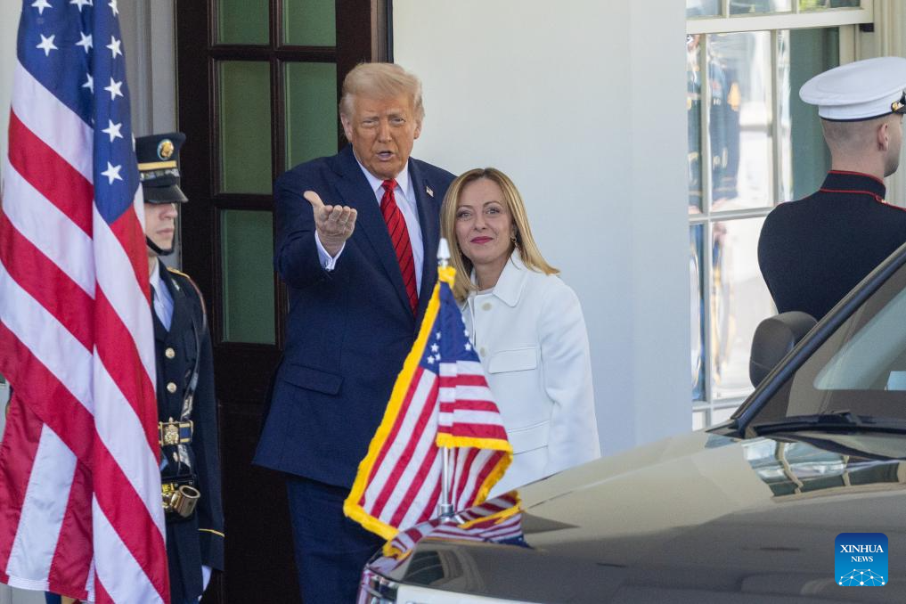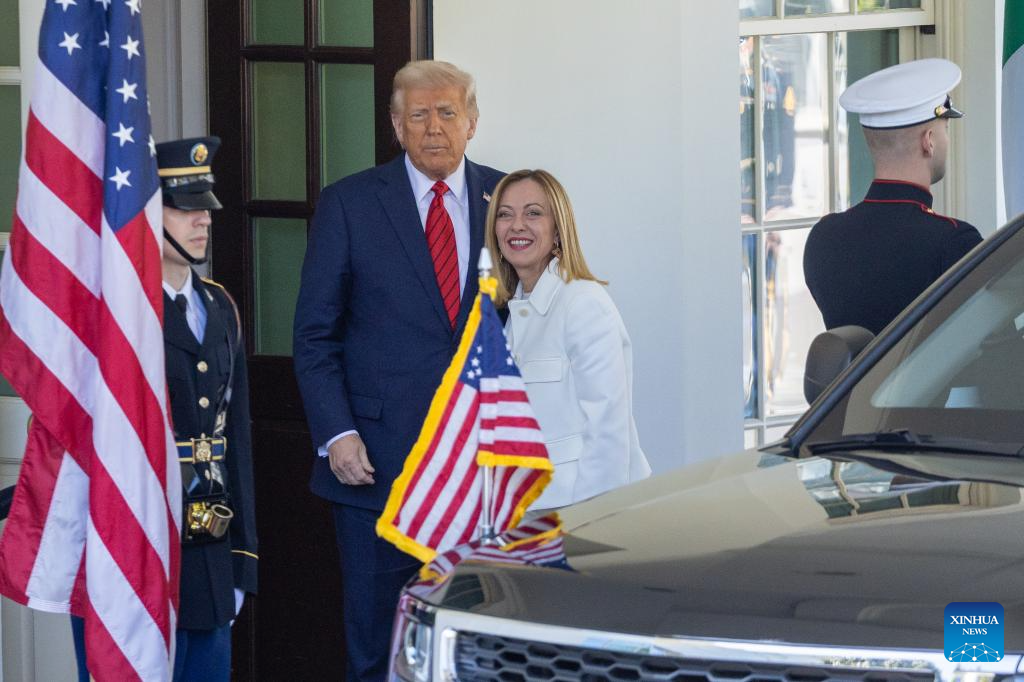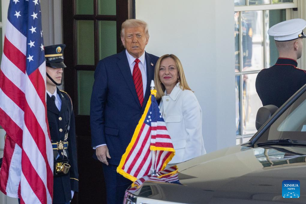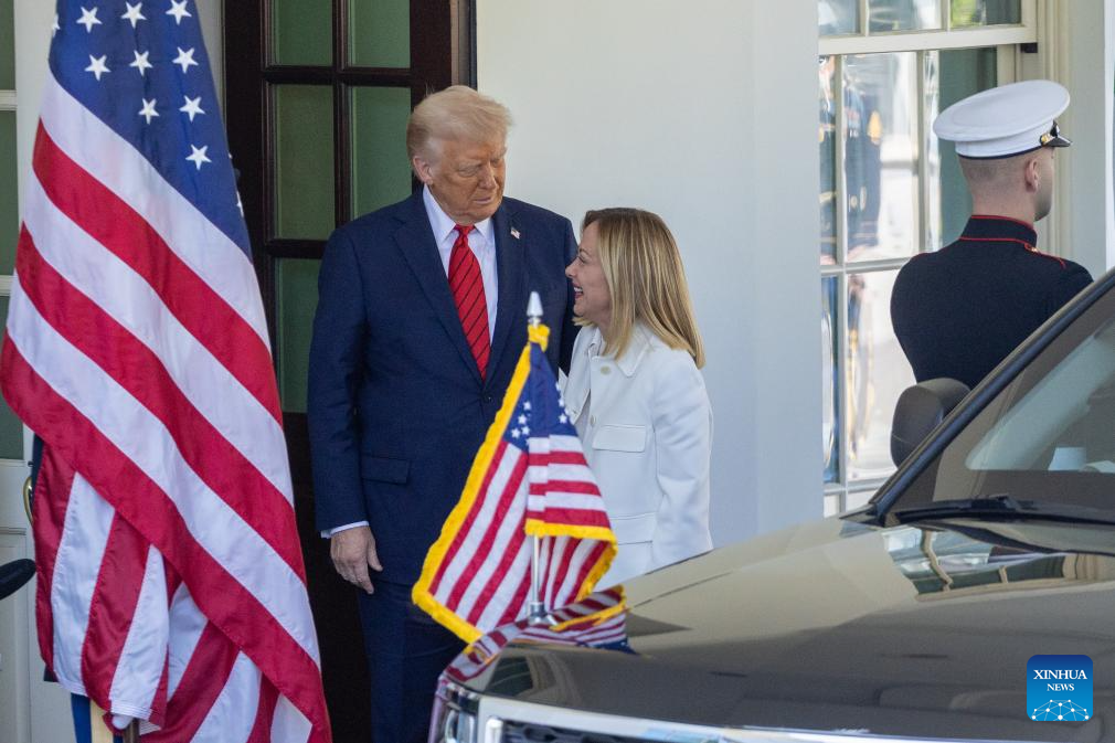 U.S. President Donald Trump (L) welcomes Italian Prime Minister Giorgia Meloni (C) at the White House in Washington, D.C., the United States, on April 17, 2025. Italian Prime Minister Giorgia Meloni met with U.S. President Donald Trump here on Thursday, with the tariff policy the main item on the agenda. (Xinhua/Hu Yousong)