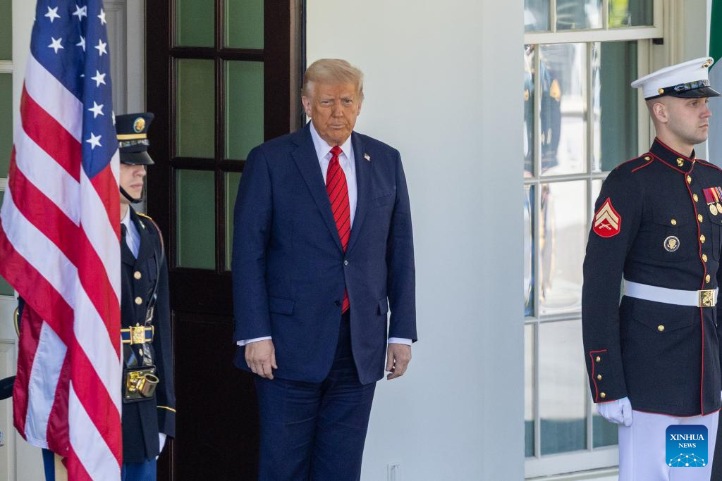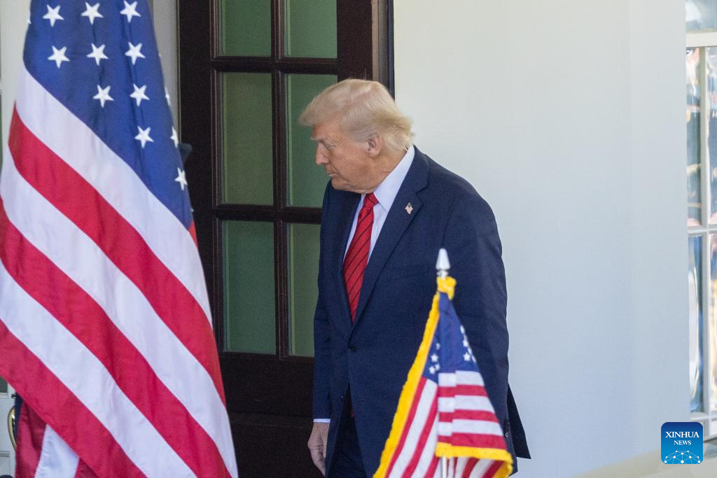 U.S. President Donald Trump heads to the West Wing after welcoming Italian Prime Minister Giorgia Meloni at the White House in Washington, D.C., the United States, on April 17, 2025. Italian Prime Minister Giorgia Meloni met with U.S. President Donald Trump here on Thursday, with the tariff policy the main item on the agenda. (Xinhua/Hu Yousong)