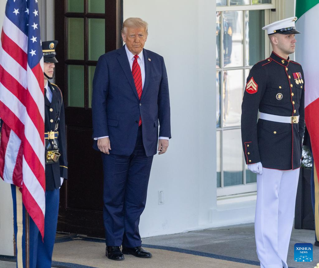 U.S. President Donald Trump (C) waits to welcome Italian Prime Minister Giorgia Meloni at the White House in Washington, D.C., the United States, on April 17, 2025. Italian Prime Minister Giorgia Meloni met with U.S. President Donald Trump here on Thursday, with the tariff policy the main item on the agenda. (Xinhua/Hu Yousong)