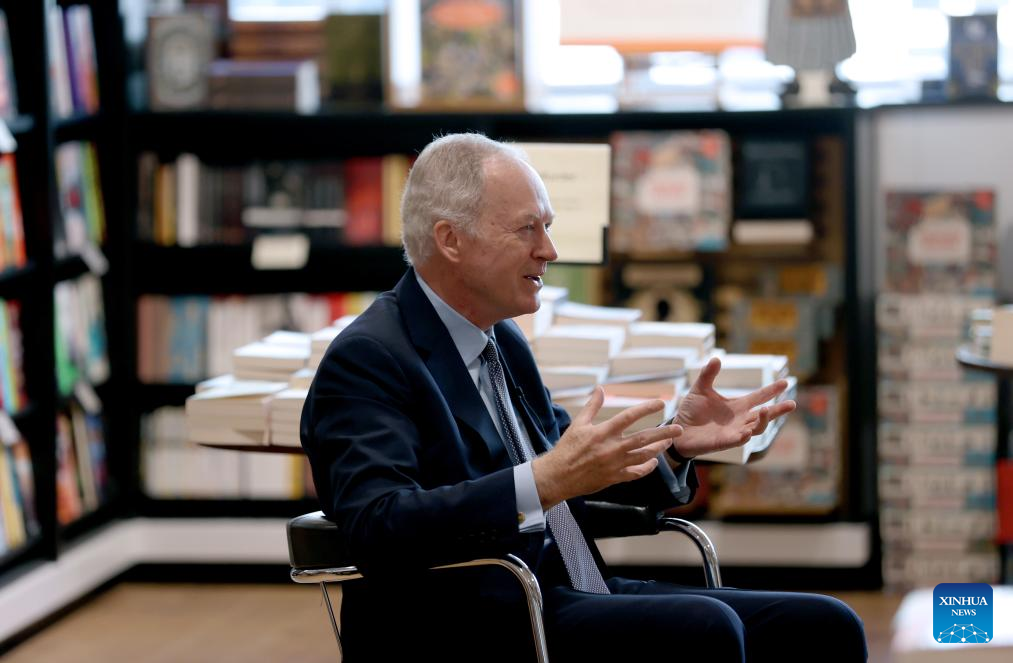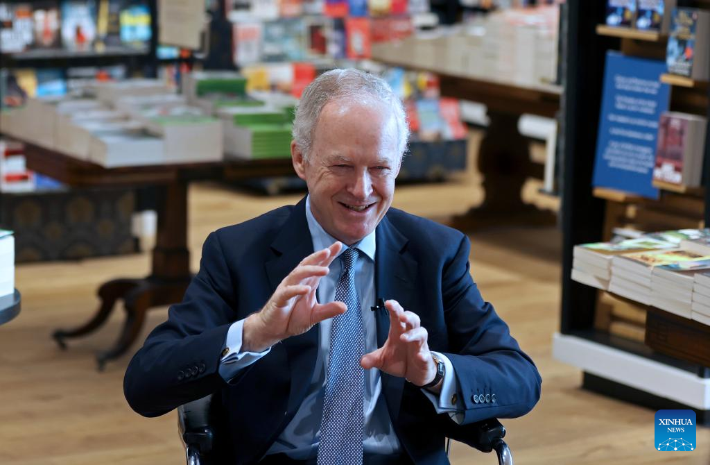 James Daunt, the managing director of Waterstones, speaks during an interview at Waterstones' flagship store in London, Britain, on April 17, 2025. From high-end urban streets to picturesque suburbs, Waterstones stands as one of Britain's most iconic bookstore brands. Yet only a decade ago, it was on the brink of bankruptcy, squeezed by the menacing rise of e-reading. Its revival is largely credited to one man who remains steadfast in his mantra -- placing the right bookstore in the right place. (Xinhua/Li Ying)