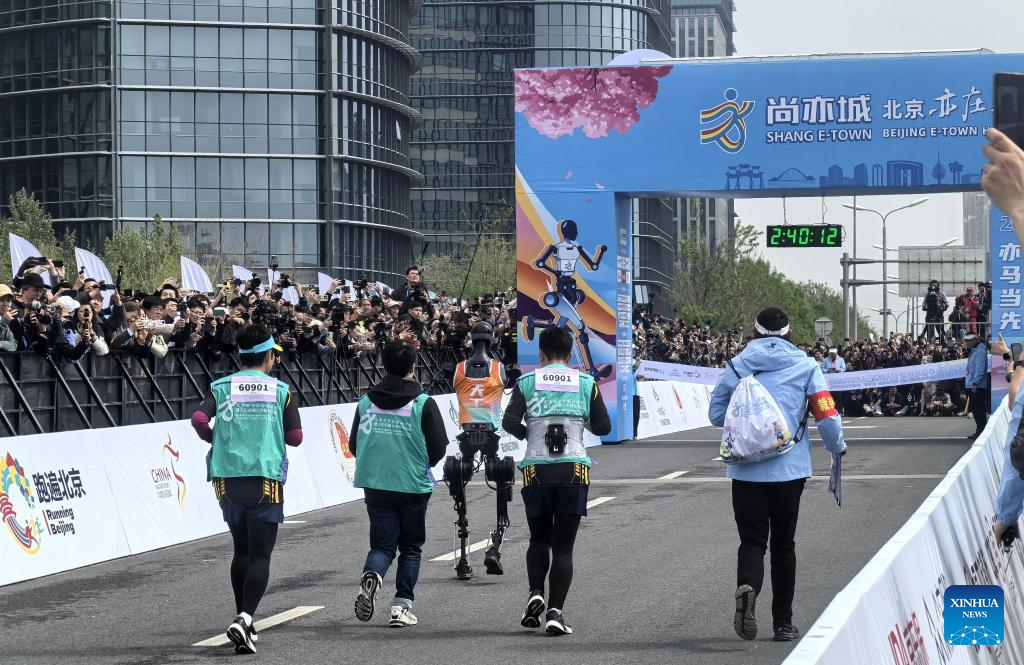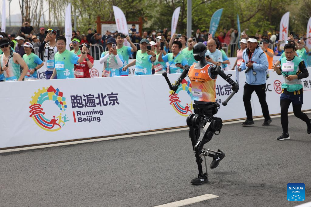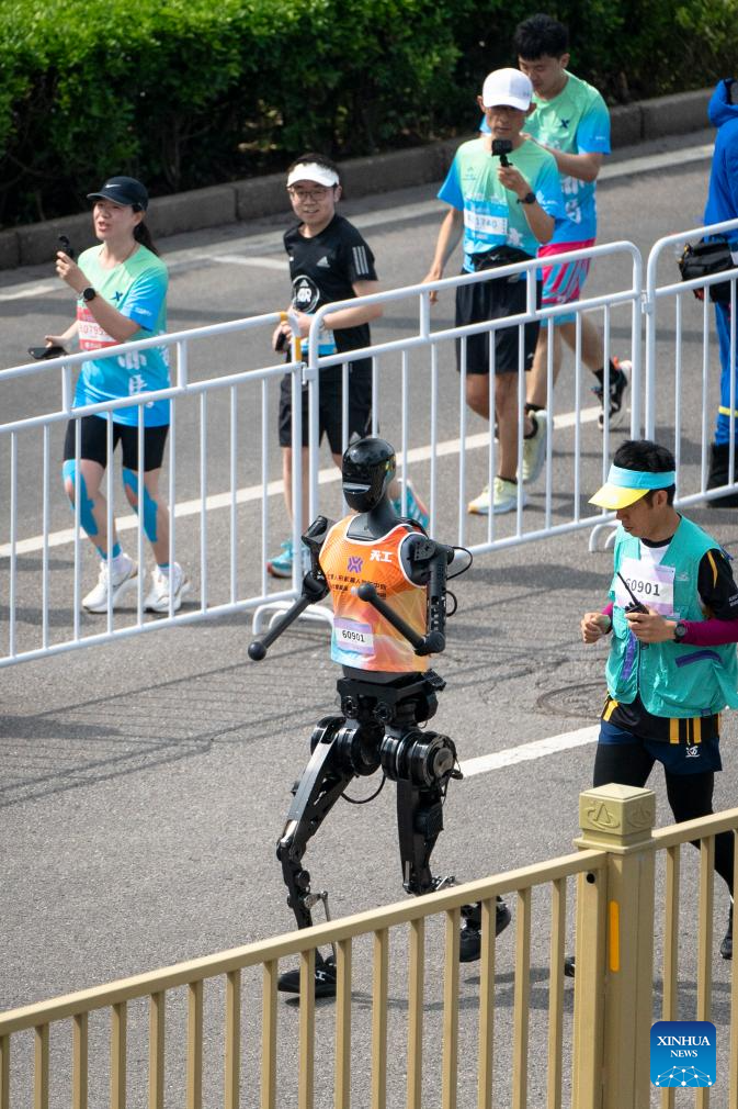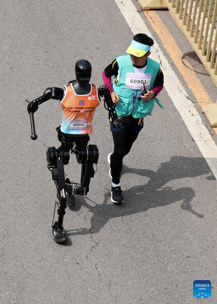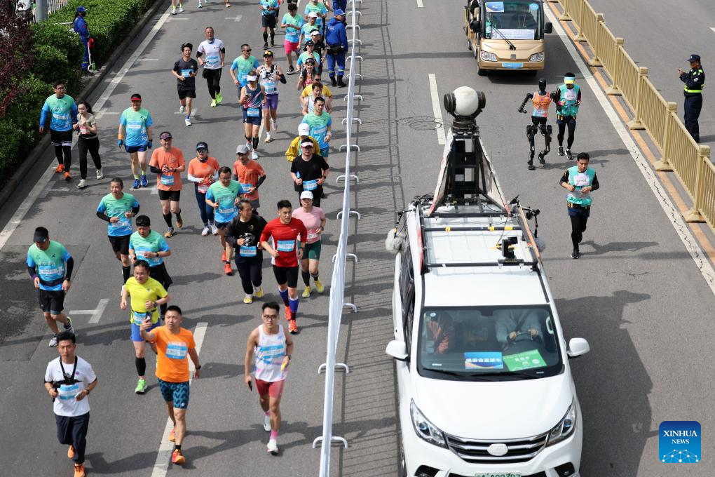 Robotic and human participants compete during the Beijing E-Town half-marathon and humanoid robots half-marathon in the Beijing Economic-Technological Development Area in southeast Beijing, China, April 19, 2025. (Xinhua/Cao Can)