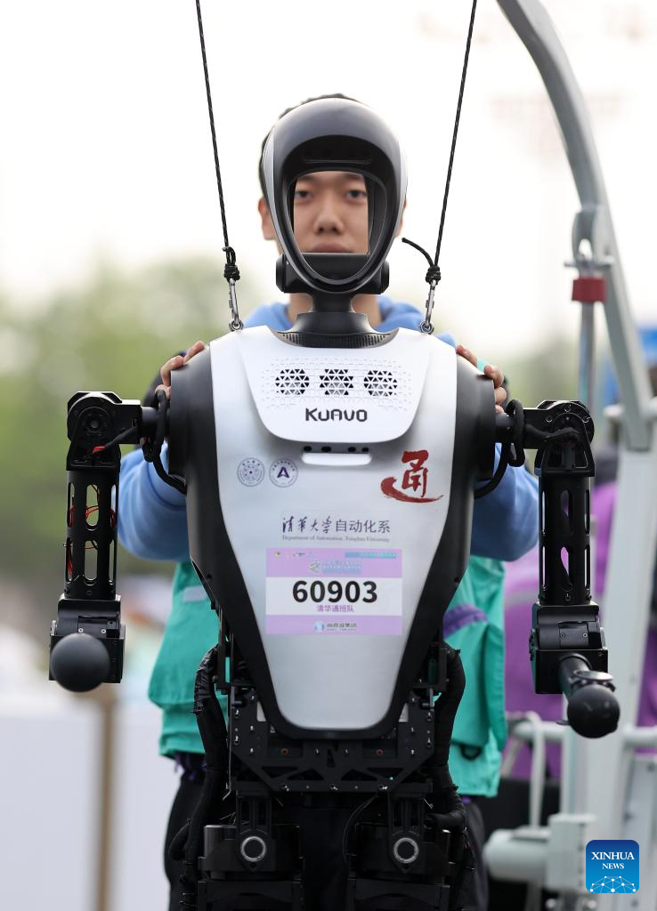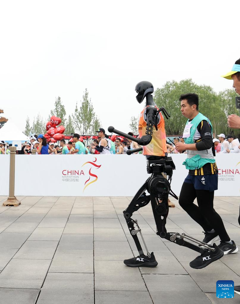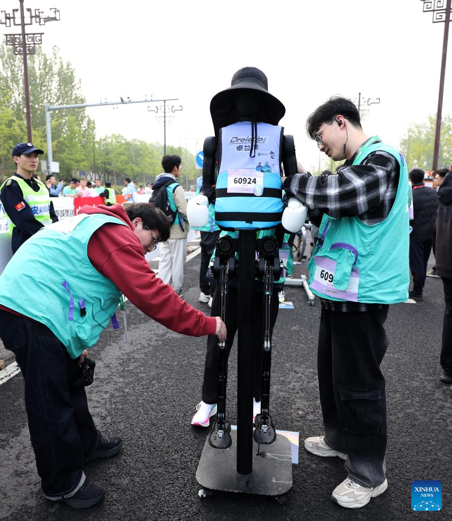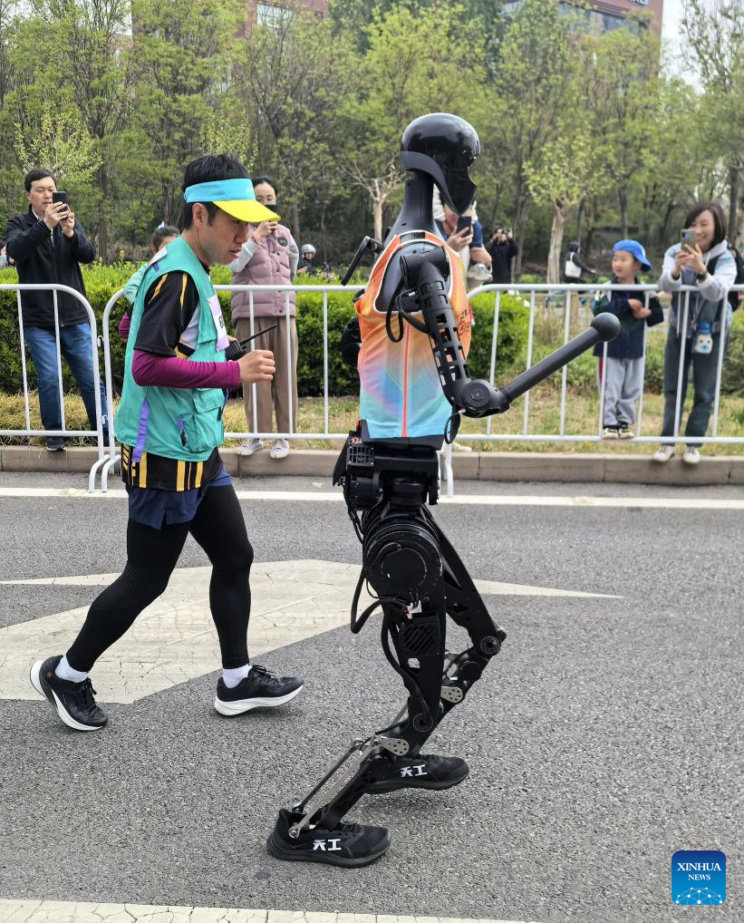 Robotic and human participants compete during the Beijing E-Town half-marathon and humanoid robots half-marathon in the Beijing Economic-Technological Development Area in southeast Beijing, China, April 19, 2025. (Xinhua/Cao Can)