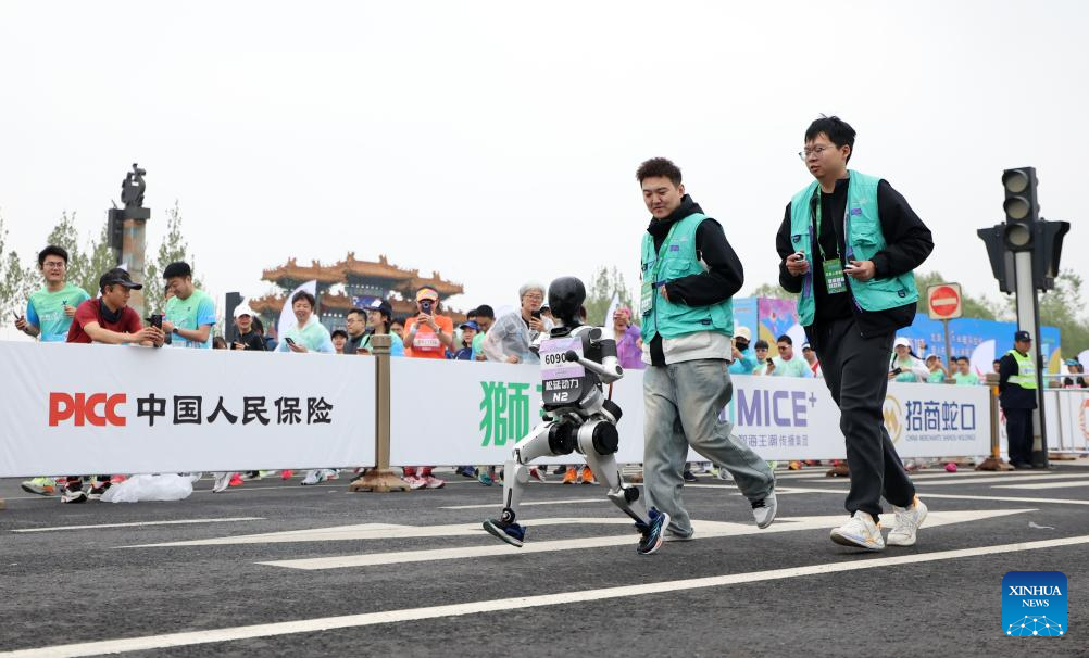 Robotic participant "N2" (front L) competes as engineers runs alongside during the Beijing E-Town half-marathon and humanoid robots half-marathon in the Beijing Economic-Technological Development Area in southeast Beijing, April 19, 2025. (Xinhua/Cao Can)