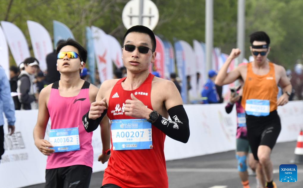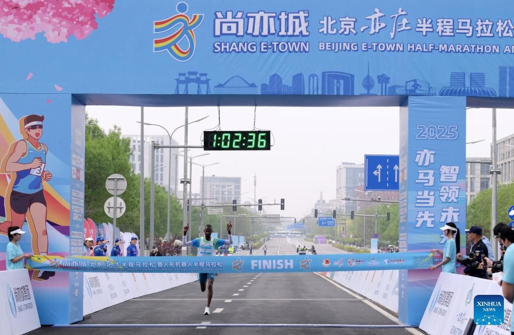 Elias Desta of Ethiopia crosses the finishing line during the Beijing E-Town half-marathon and humanoid robots half-marathon in the Beijing Economic-Technological Development Area in southeast Beijing, April 19, 2025. (Xinhua/Li He)