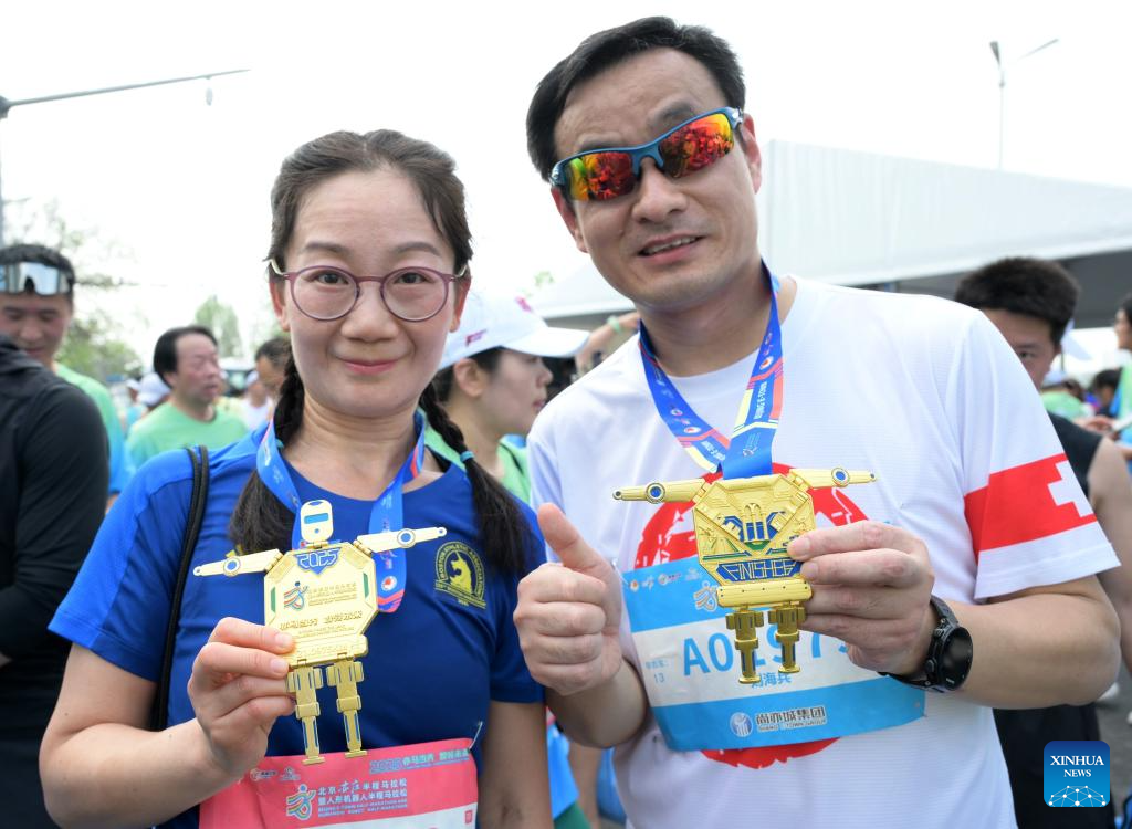 Paticipants show their finisher medals after the Beijing E-Town half-marathon and humanoid robots half-marathon in the Beijing Economic-Technological Development Area in southeast Beijing, China, April 19, 2025. (Xinhua/Li He)