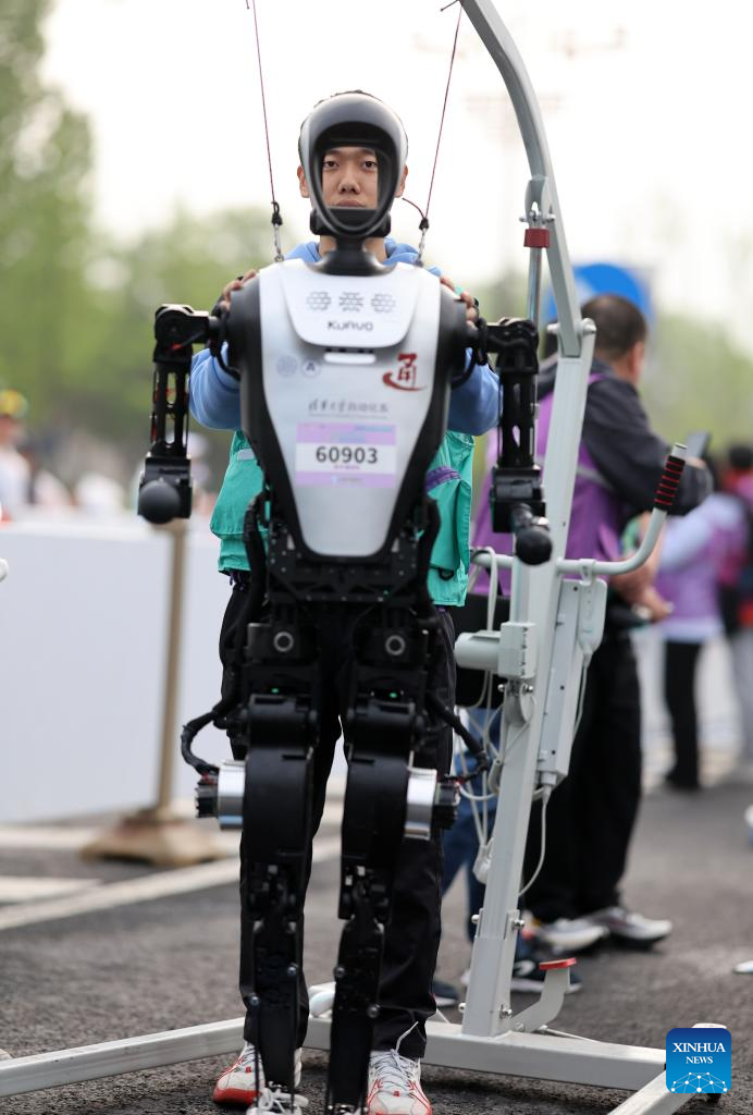 Robotic and human participants start during the Beijing E-Town half-marathon and humanoid robots half-marathon in the Beijing Economic-Technological Development Area in southeast Beijing, China, April 19, 2025. (Xinhua/Zhang Chenlin)