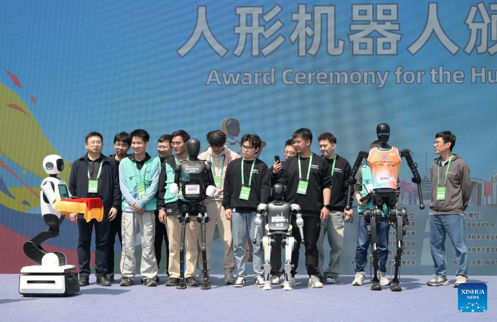 A robot holding medals moves towards robotic participants and engineers during the awarding ceremony for humanoid robots after the Beijing E-Town half-marathon and humanoid robots half-marathon in the Beijing Economic-Technological Development Area in southeast Beijing, China, April 19, 2025. (Xinhua/Li He)