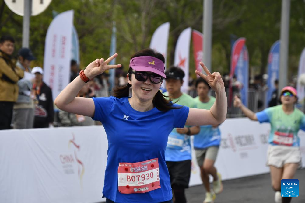 A participant take photos of the finisher medal after the Beijing E-Town half-marathon and humanoid robots half-marathon in the Beijing Economic-Technological Development Area in southeast Beijing, China, April 19, 2025. (Xinhua/Li He)