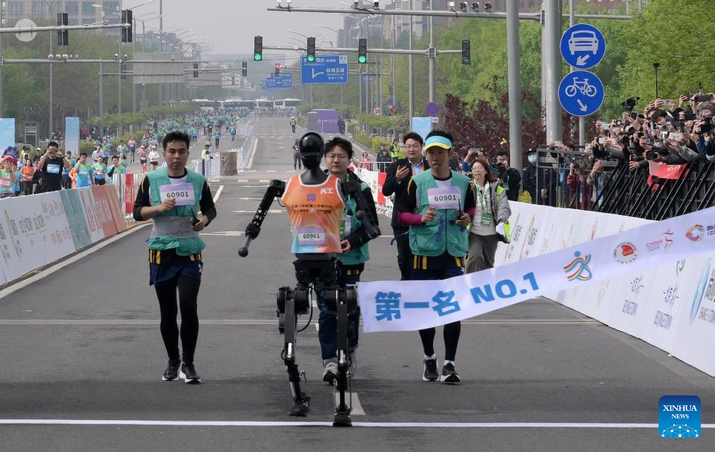 Robotic participant "Tiangong Ultra" (2nd L) crosses the finishing line as engineers run alongside during the Beijing E-Town half-marathon and humanoid robots half-marathon in the Beijing Economic-Technological Development Area in southeast Beijing, China, April 19, 2025. (Xinhua/Li He)