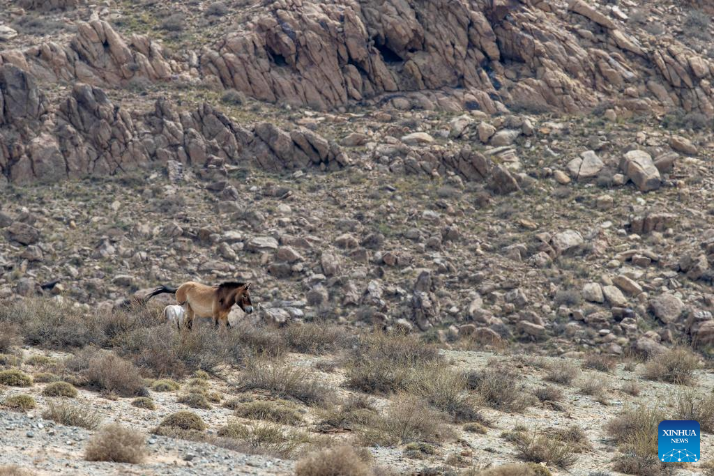 Przewalski's horses are seen at the Helan Mountain Nature Reserve in northwest China's Ningxia Hui Autonomous Region, April 17, 2025. The Przewalski's horse is listed as endangered by the International Union for Conservation of Nature Red List of Threatened Species and is under first-class national protection.