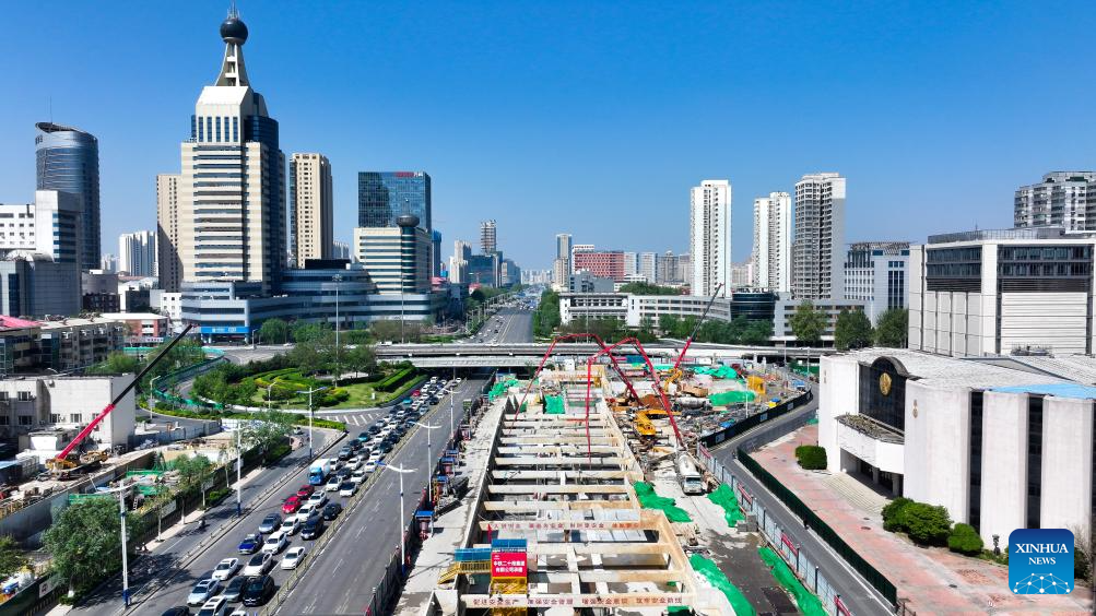 An aerial drone photo taken on April 19, 2025 shows the capping of the main structure of Bayi Overpass Station of Jinan Metro Line 4 (Phase I) in Jinan, east China's Shandong Province. With the successful capping of the main structure of Bayi Overpass Station, the construction of the main structure of Jinan Metro Line 4 (Phase I) has been completed. (Xinhua/Guo Xulei)