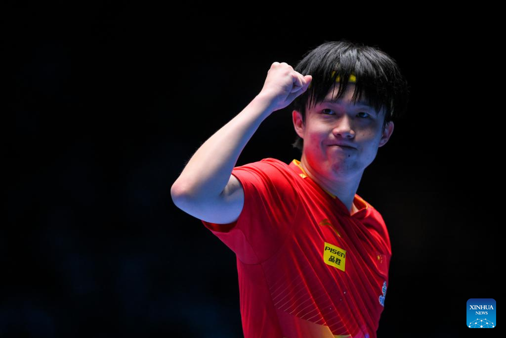 Wang Chuqin celebrates scoring during the men's singles semifinal between Wang Chuqin of China and Hugo Calderano of Brazil at the ITTF Men's and Women's World Cup 2025 in Macao, China, April 19, 2025. (Xinhua/Chen Duo)