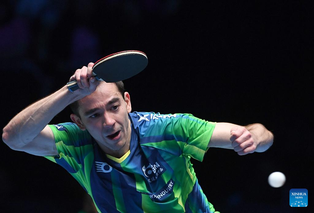 Hugo Calderano hits a return during the men's singles semifinal between Wang Chuqin of China and Hugo Calderano of Brazil at the ITTF Men's and Women's World Cup 2025 in Macao, China, April 19, 2025. (Xinhua/Chen Duo)