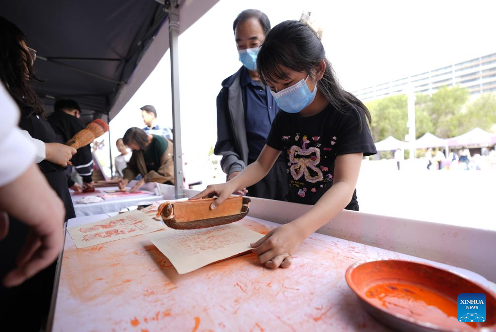 Citizens experience woodblock printing during a civil reading event in Yinchuan, northwest China's Ningxia Hui Autonomous Region, April 20, 2025. The event was held here on Sunday to raise awareness of reading among the public. (Xinhua/Wang Peng)